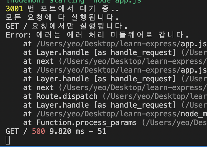 GET / 500 9.820ms - 51 해당 로그는 morgan 미들웨어에서 나오는 것이다.