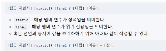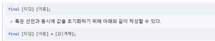 ▶ 멤버 변수 타입 앞에 final 키워드를 추가함으로써 해당 멤버 변수가 읽기 전용임을 표시할 수 있다.