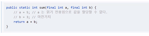 ▶ 메서드의 매개 변수 타입 앞에 final 키워드를 추가함으로써 해당 매개 변수가 읽기 전용임을 표시할 수 있다.