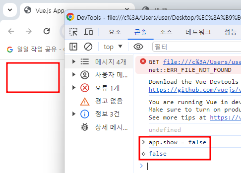 콘솔에 app.show = false 입력하면 p태그가 DOM에서 제거됨