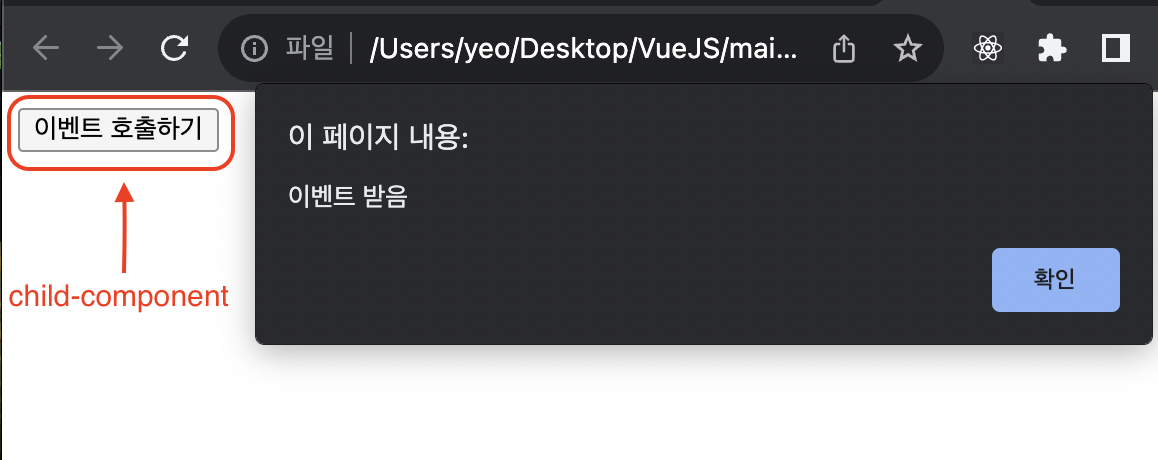 자식 컴포넌트의 버튼을 클릭하면 부모 컴포넌트에서 등록한 핸들러가 호출되어 alert 이 출력된다.